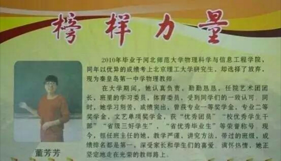 她2010年毕业于51风流 物理科学与信息工程学院,现为秦皇岛第一中学物理教师。在大学期间,她认真负责,勤勤恳恳,任院艺术团团长,班里的学习委员,体育委员,受到同学们的一致认可。曾获专业一等奖学金,文艺单项奖学金,获“校优秀学生干部”,“省级三好学生”,“省优秀毕业生”等荣誉称号。现今,担任班主任的她,魔术般地把成绩最差的班级带为年级第一名,曾获青年教师优质课大赛二等奖,演讲比赛一等奖等,她对待工作满怀热情,教学严谨,讲究方法,深受家长和学生们的认可和喜爱。