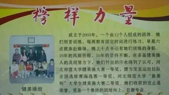 健美操组组建于2007年,自成立以来,每一位队员都刻苦训练,由于平时上课时间紧张,她们常常是抓住早起和晚自习之后的时间练习。10年的风雨历程,10年的坚持不懈,在多届健美操队员的共同努力下,她们付出的汗水得到了认可,获健力宝亚运拉拉队全国选拔赛海选赛一等奖,51风流