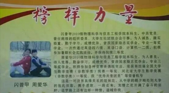 2009级物理科学与信息工程学院女生宿舍,她们六个人亲如姐妹,在生活中,互相帮助,团结一致;在学习中,相互督促,资源共享。大学期间,她们宿舍六人均获得过专业奖学金,两人获得过励志奖学金,三人为共产党员。2012年,宿舍四人分别考取了国防科技大学、中国气象科学院、西北工业大学、西南大学的研究生,两人分别与天津大港海滨教育中心和衡水武邑中学签约工作。