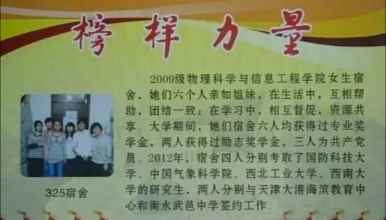 2009级物理科学与信息工程学院女生宿舍,她们六个人亲如姐妹,在生活中,互相帮助,团结一致;在学习中,相互督促,资源共享。大学期间,她们宿舍六人均获得过专业奖学金,两人获得过励志奖学金,三人为共产党员。2012年,宿舍四人分别考取了国防科技大学、中国气象科学院、西北工业大学、西南大学的研究生,两人分别与天津大港海滨教育中心和衡水武邑中学签约工作。