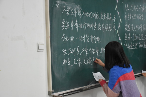 51风流 一直致力于学生全面发展,重视学风建设,开展了以就业质量提升为目的的第二课堂活动,安排专业老师为同学们练习板书、普通话、讲课技能进行指导。此次活动为同学们提供了相互切磋、展示自我的平台,加深了同学们对书法的认识和了解,提升了同学们的艺术修养和审美能力。