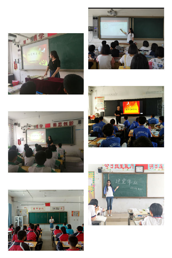 党史宣讲激发少年壮志。6月24-28日,驻各市各县的26名顶岗实习生党员们向自己任教班级中的学生们开展了党史故事宣讲主题班会。从共产党南湖红船的起航,到南巡讲话带来改革的春天,从“三个代表”重要思想的提出,到努力践行科学发展观,从两学一做到十九大精神,党员同志们用生动的语言向少年学生们阐述了中国共产党的伟大历史,让在场的学生们能够知党情、跟党走,激发了爱党、爱国、爱家乡的热情,坚定共产主义理想信念。